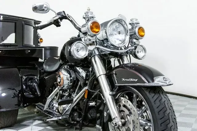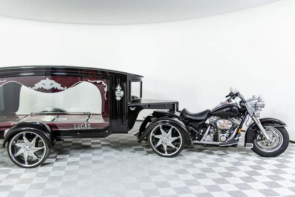 Our unique 'Last Ride DFW' provides access to our motorcycle hearse to the Dallas Fort Worth area and offers families a very unique way to celebrate the life of a loved one. This motorcycle hearse is pulled by an Anniversary Edition Harley Davidson Road King and tows a custom 5th wheel Tombstone Hearse. This motorcycle/hearse combination can easily accommodate an urn or a casket and with a glass Tombstone hearse, the casket or urn is visible on all sides. This Harley Davidson and Tombstone Hearse is a great choice for those who were motorcycle enthusiasts, police and fire professionals, veterans and anyone who would like to organize an unforgettable Last Ride.